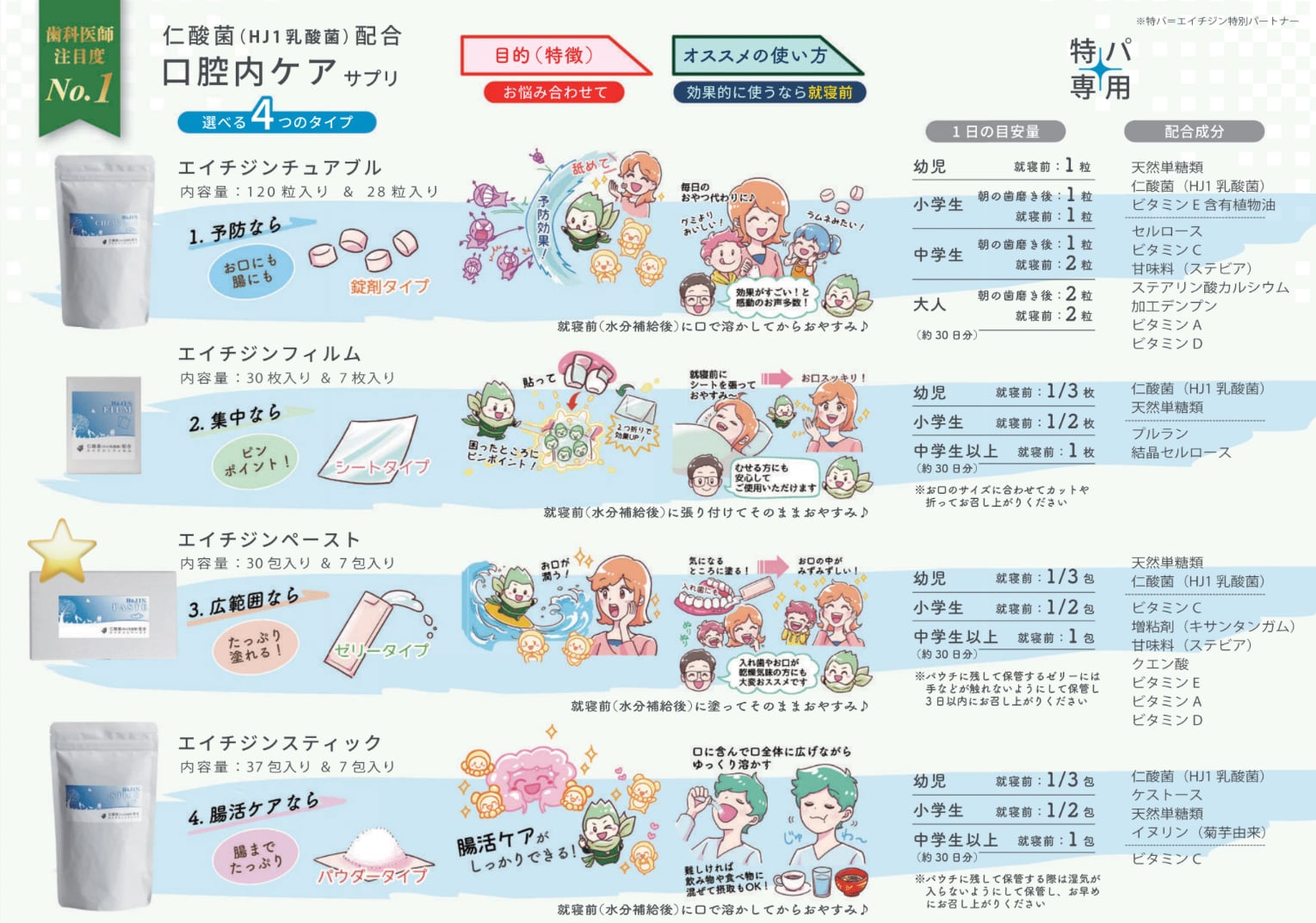 **仁酸菌(HJ1乳酸菌)配合の口腔ケアサプリメント『エイチジンシリーズ』**です。