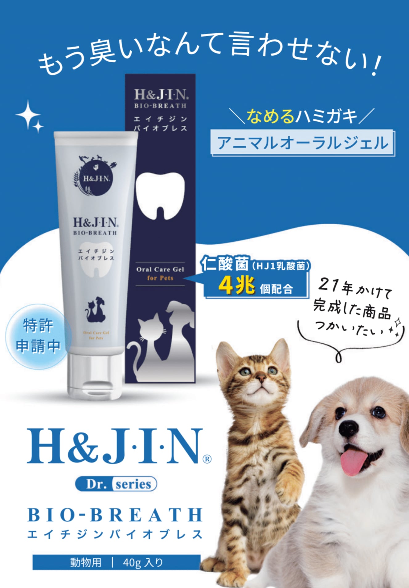 21年かけて完成した「なめるハミガキ」乳酸菌エイチジンバイオブレスは、HJ1乳酸菌を配合したオクチもオナカも喜ぶアニマルオーラルケアジェルです。